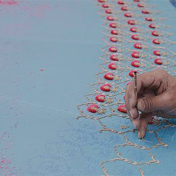 Design Tracing: A pre-drawn pattern is traced onto the fabric using chalk powder or tracing paper.